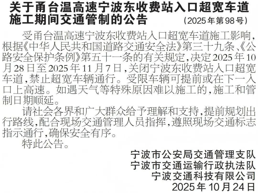 为进一步优化我市鄞州区首南街道辖区道路交通环境,提高货车通行管理的规范化、精细化、便利化水平,更好服务经济社会发展,根据《中华人民共和国道路交通安全法》第三十九条的有关规定,决定自2025年10月27日起对由鄞州大道-沧海南路-庆元大道-天童南路-G1504宁波绕城高速-小江湖路-高阳路-明光路围成的封闭区域内道路(不含封闭区边界道路)货车通行交通组织方案进行调整,具体措施如下: