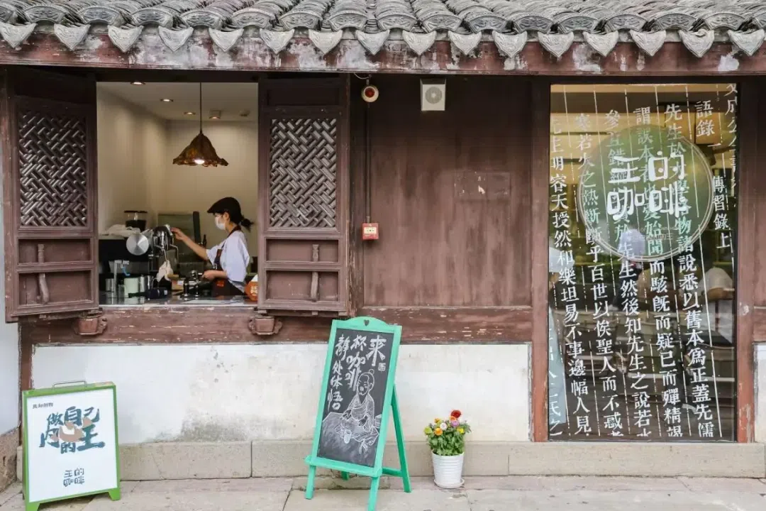 今年5月,王阳明故居新开文创店“王的咖啡”。主理人、90后李福彬引入他开发的冰箱贴、阳明公仔、书法包等诸多阳明文创。店铺slogan(标语)“做自己内心的王”,完成阳明哲学的通俗转译,深受年轻人欢迎。