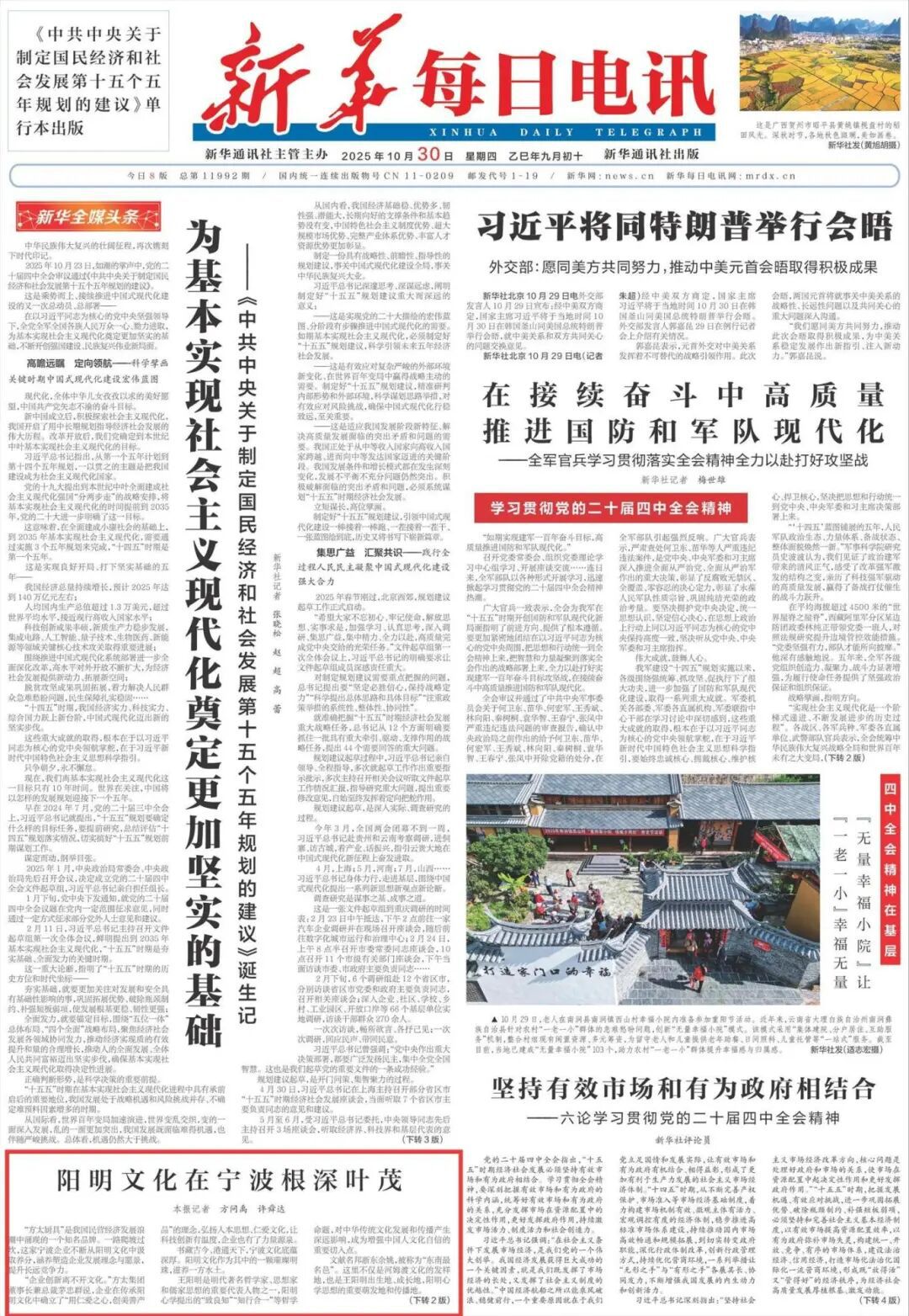 10月30日,《新华每日电讯》头版刊发报道《阳明文化在宁波根深叶茂》,聚焦阳明文化在宁波的传承与弘扬。