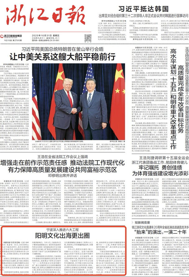 10月30日、31日,《浙江日报》专版和头版分别刊发报道《深挖阳明文化当代价值 宁波以“知行合一”解码文化强市之道》和《宁波深入推进六大工程 阳明文化出海更出圈》,展现了宁波作为一座文脉浩荡、底蕴深厚的国家历史文化名城,在加快建设现代化滨海大都市的进程中,正以更加自觉的姿态,全力挖掘经济高速发展背后的文化动力。近年来,宁波以“阳明文化海外‘行’——优秀传统文化传承传播行动”为牵引,聚力实施阳明文化全球传播联盟构建工程、溯源研究传承弘扬工程等“六大工程”,创新传播载体和方式,推动阳明文化“出海”传播,使阳明文化可行、远行,实现从“文化自信”到“文化他信”的转变。