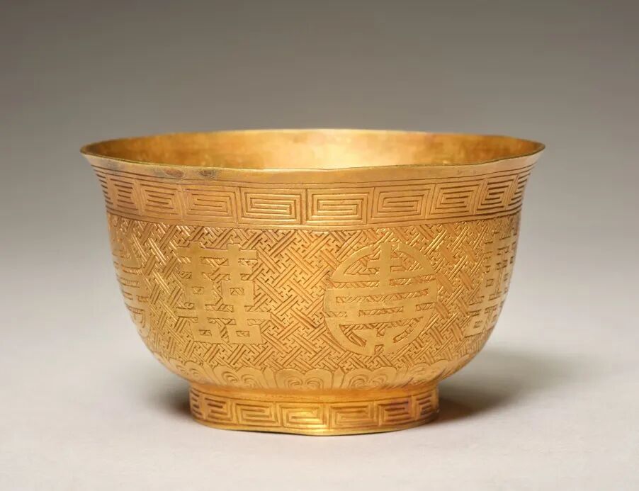 这只金碗是清代同治皇帝大婚时的用品。可以看到,外壁通体錾刻细密底纹,腹部四面双钩篆书“囍”“寿”主体纹样,形成“双喜临门、福寿连绵”的吉祥意境。