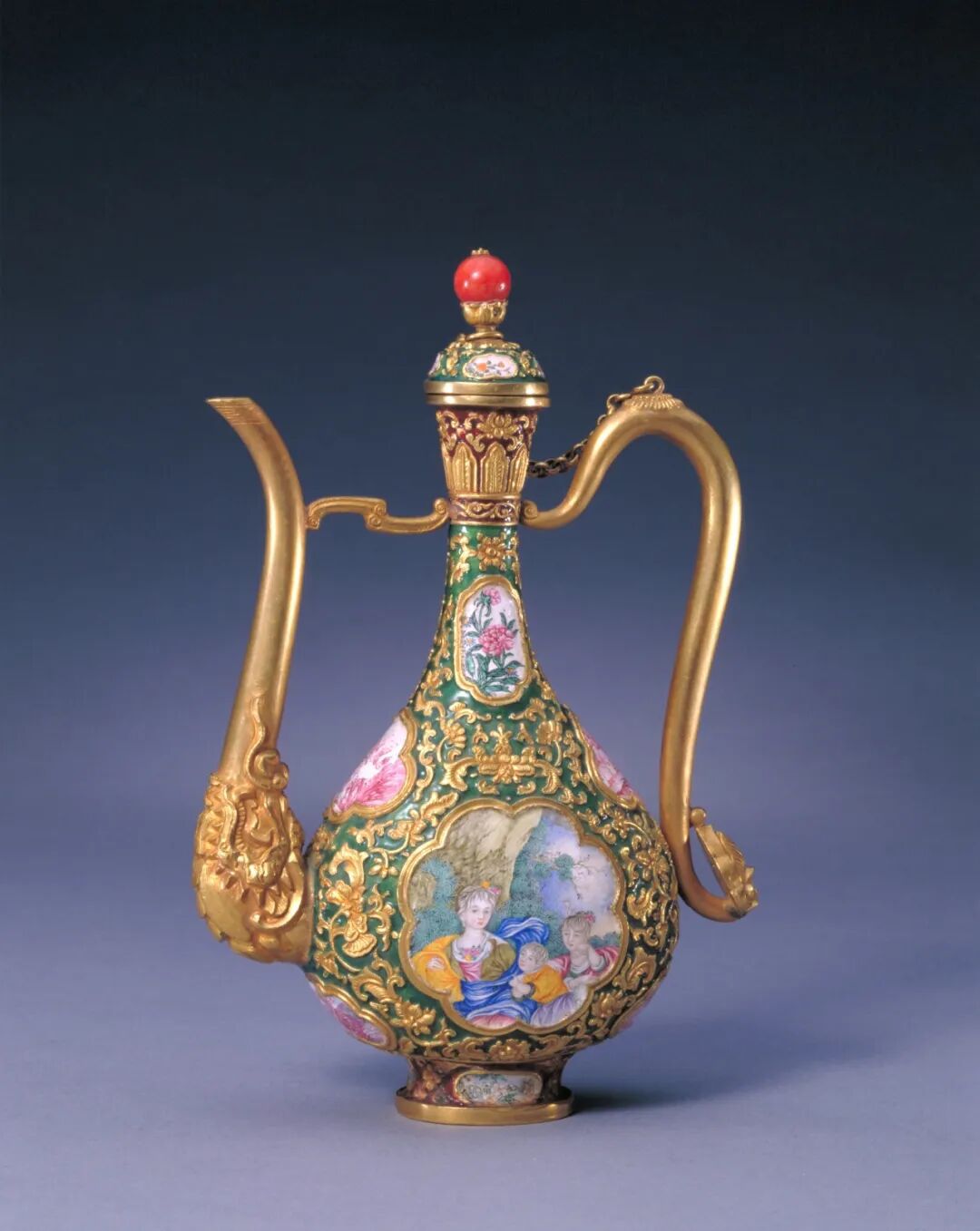 乾隆时期的画珐琅中出现了以西洋人物、建筑为内容的装饰,中西文化合璧是乾隆时期珐琅器的一大特色。从这件藏品中,也能了解到“乾隆审美”。