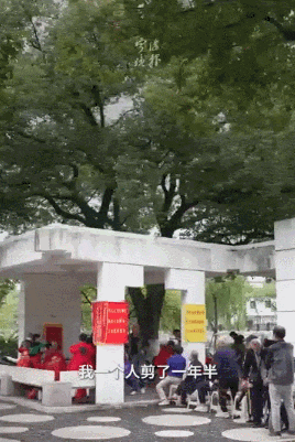 正为排队等候的市民修剪头发