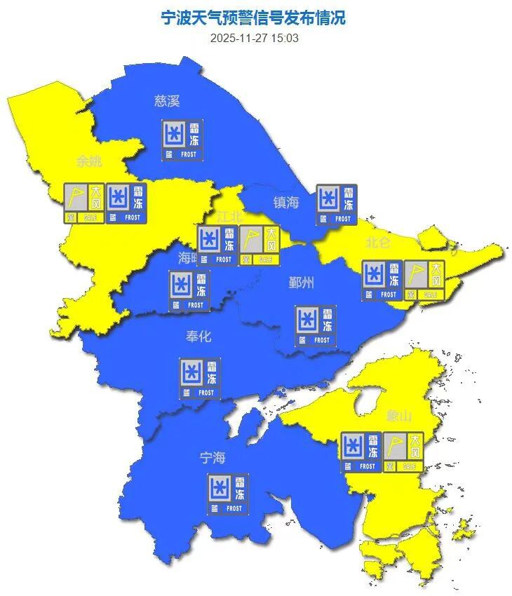 宁波各区(县、市)均已发布霜冻蓝色预警信号;江北区、北仑区、余姚市、象山县发布大风黄色预警信号。