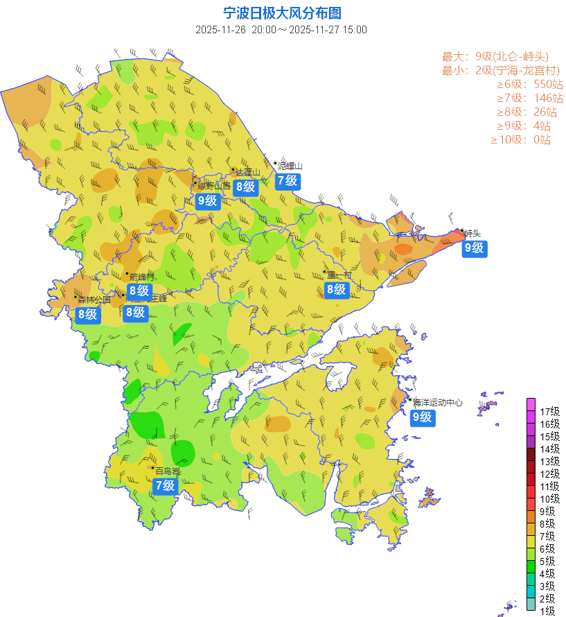 2025年11月26日20时至27日15时,宁波全市日极大风最大测站为北仑峙头站(郭巨)23.9米/秒(9级,出现时间:11月27日13:31),次大为北仑后焦山站(白峰)23.5米/秒(9级,出现时间:11月27日13:26)。