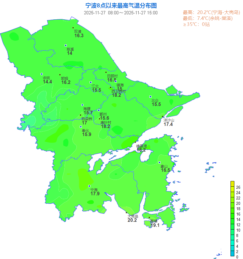 2025年11月27日8时至15时,宁波全市代表站气温最高为宁海站17.9℃。