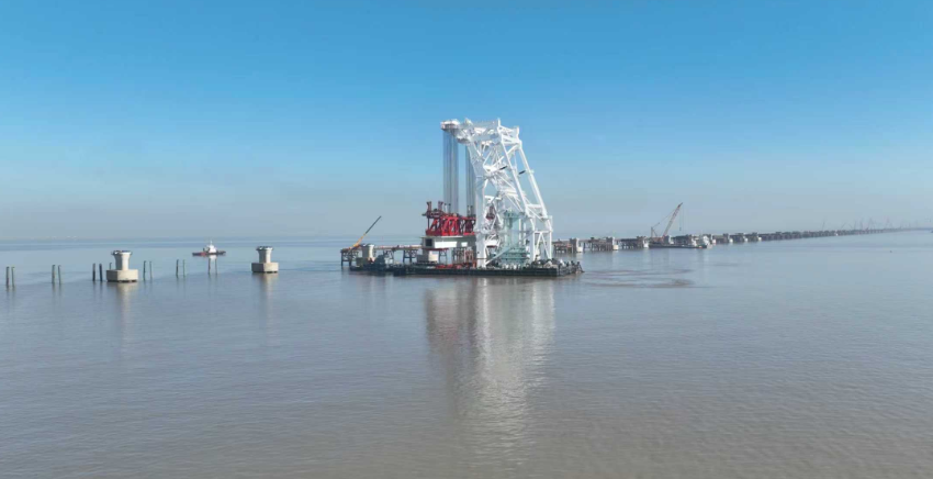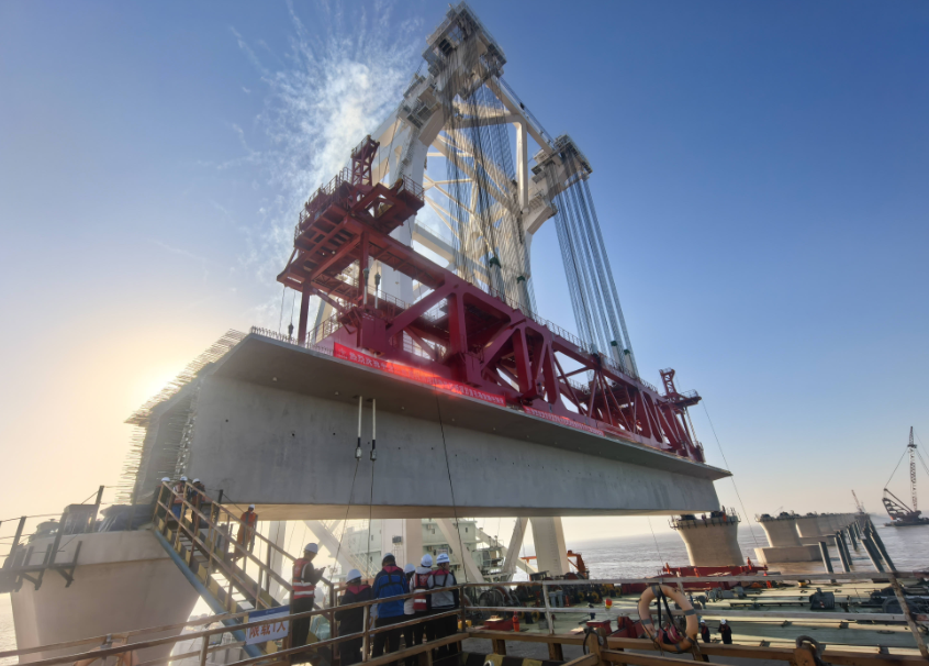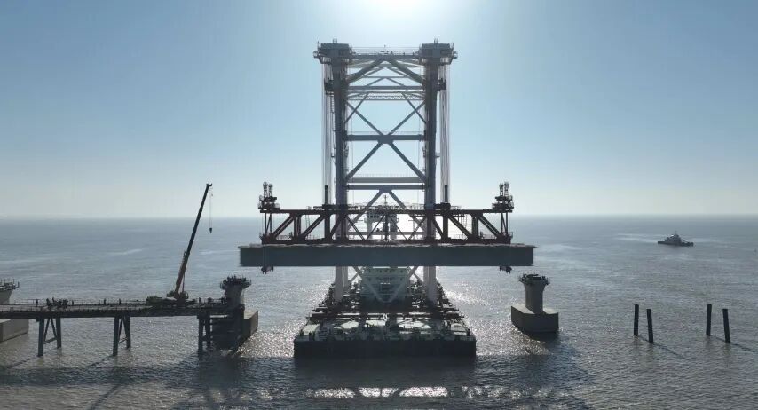 初冬的杭州湾,午后的阳光洒在波澜壮阔的海面上。11月29日下午3时,在世界三大强潮海湾之一的杭州湾上,通苏嘉甬高铁控制性工程——杭州湾跨海铁路桥宁波侧首孔箱梁成功架设,标志着这座创下多项世界纪录的跨海大桥正式进入南北双线同步架梁的新阶段。