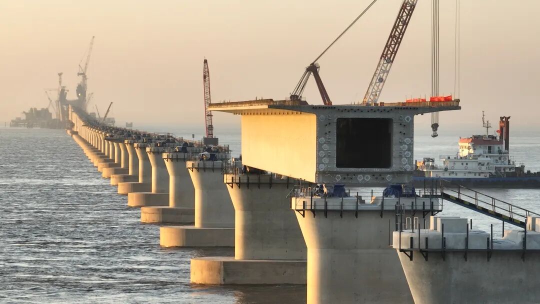据悉,大桥海中引桥部分采用230孔预制箱梁,涵盖80米和60米两种跨径,最长联达3080米,其“超长联、大跨度”设计创下了高速铁路混凝土连续梁的世界纪录。