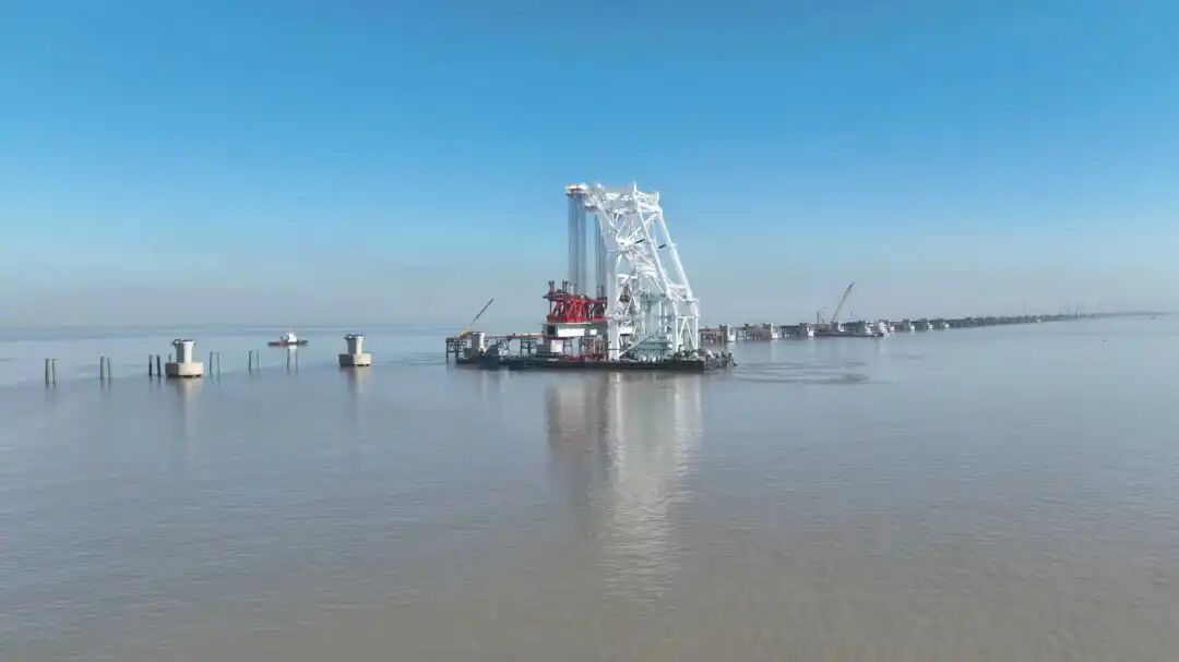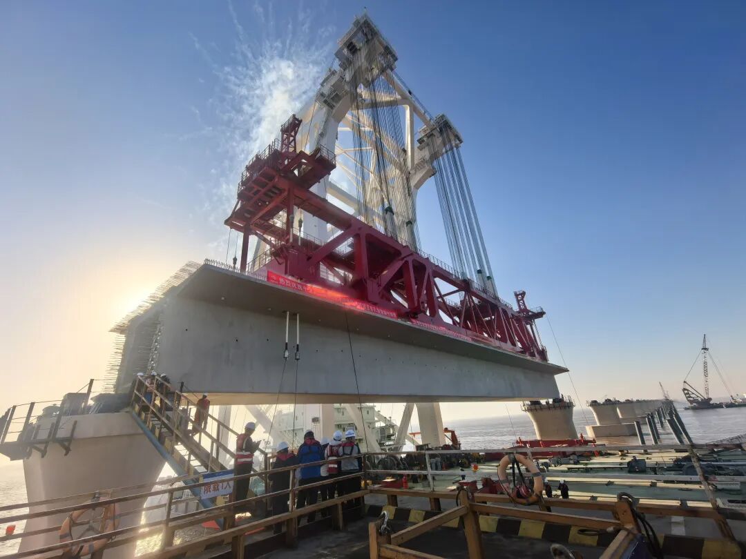 9月底,大桥嘉兴侧已率先启动架梁。此次随着宁波侧架梁施工的全面展开,大桥实现南北两侧同步推进架梁,全面进入建设提速阶段。