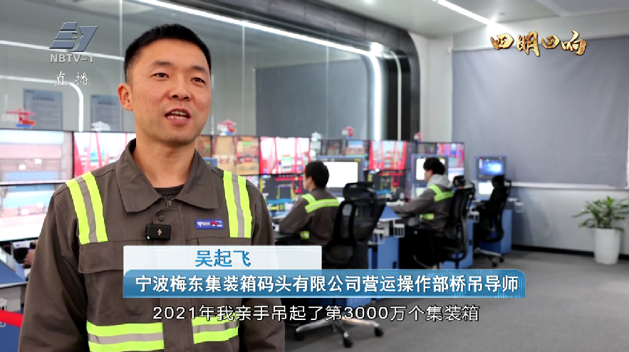 宁波梅东集装箱码头有限公司营运操作部桥吊导师 吴起飞:2021年我亲手吊起了第3000万个集装箱,今天我又吊起了第4000万个集装箱,亲历了这一个个激动人心的时刻,我感到非常的自豪。