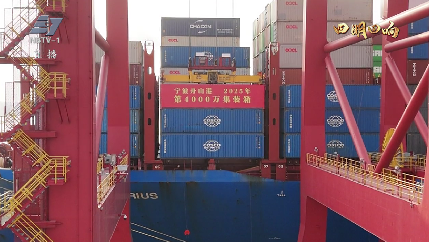 记者 董寅寅:我现在是在宁波舟山港梅山港区。随着我身后的这个集装箱被缓缓起吊装船后,宁波舟山港正式迈入年吞吐量超4000万标准箱的新时代。4000万标准箱意味着什么?我们把集装箱首尾相连可绕地球赤道超6圈,规模相当于整个南美洲一年的集装箱总量。