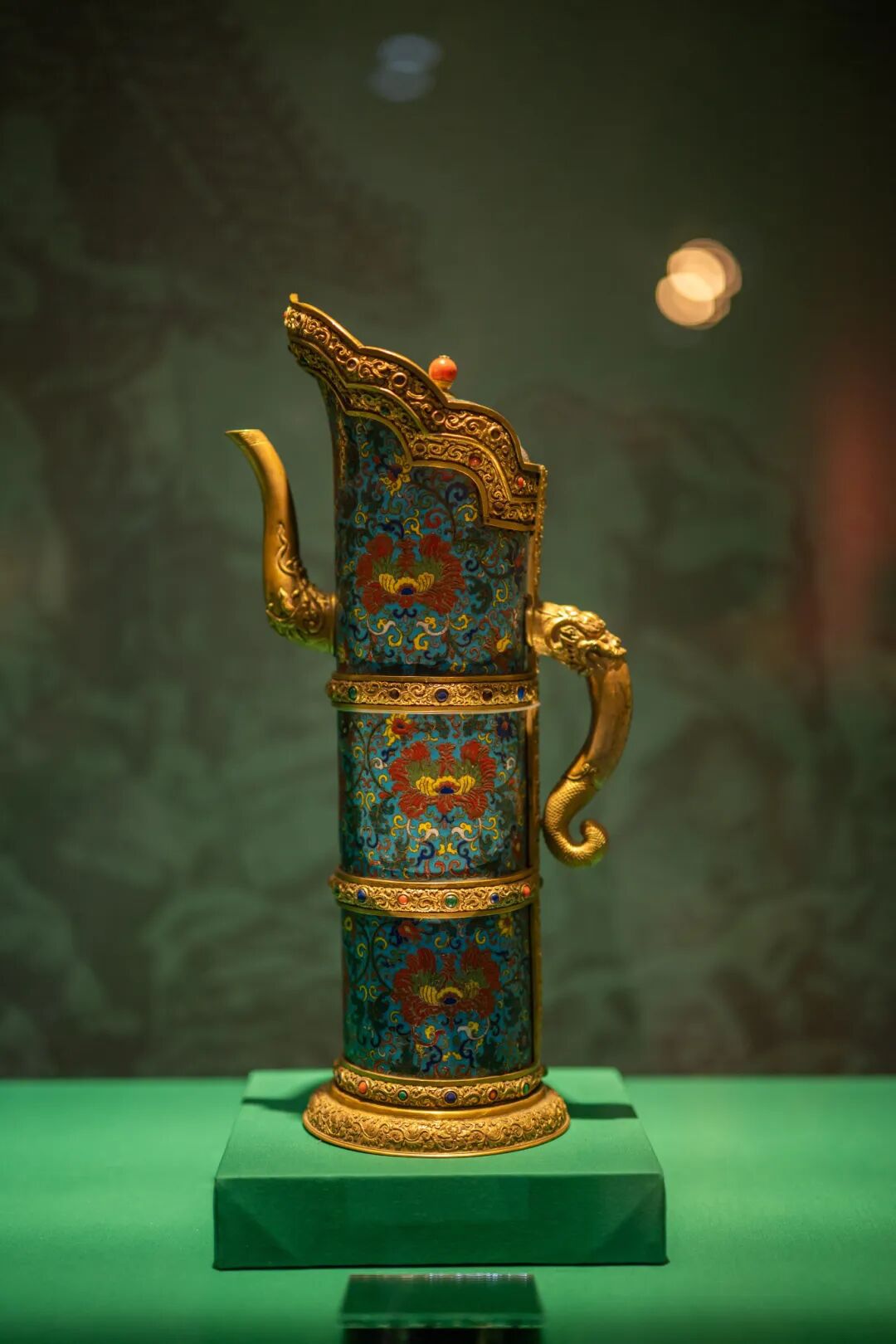 ▲清乾隆 掐丝珐琅勾莲纹嵌石多穆壶 故宫博物院藏