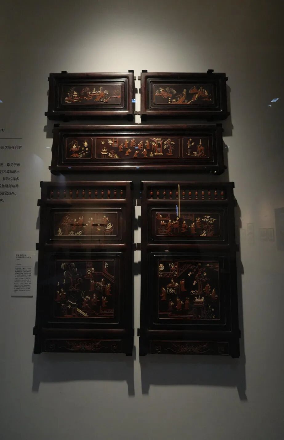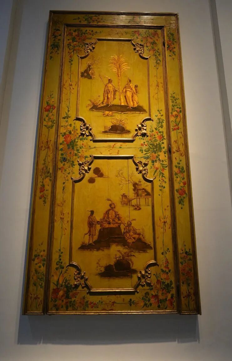 一组采用宁波骨木镶嵌工艺制作的清红木花板,与一扇来自意大利雷佐尼科宫的彩绘门也被“并置”。前者以象牙及黄杨木为嵌件,镶嵌山水、花鸟、人物故事图案,用料考究、做工精细、配色雅致;后者则展现了洛可可时期欧洲对东方的浪漫化诠释,反映东西方装饰艺术的美学交融。