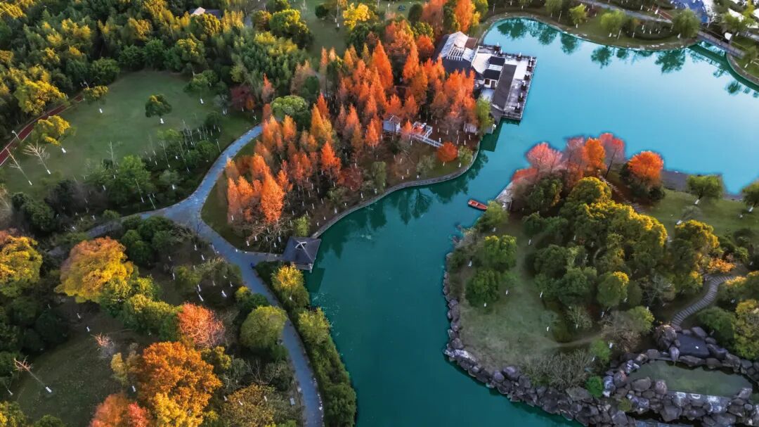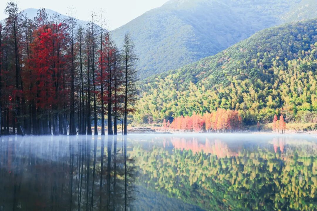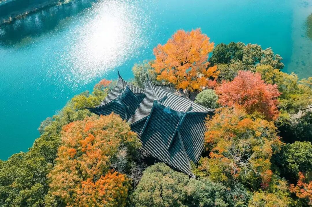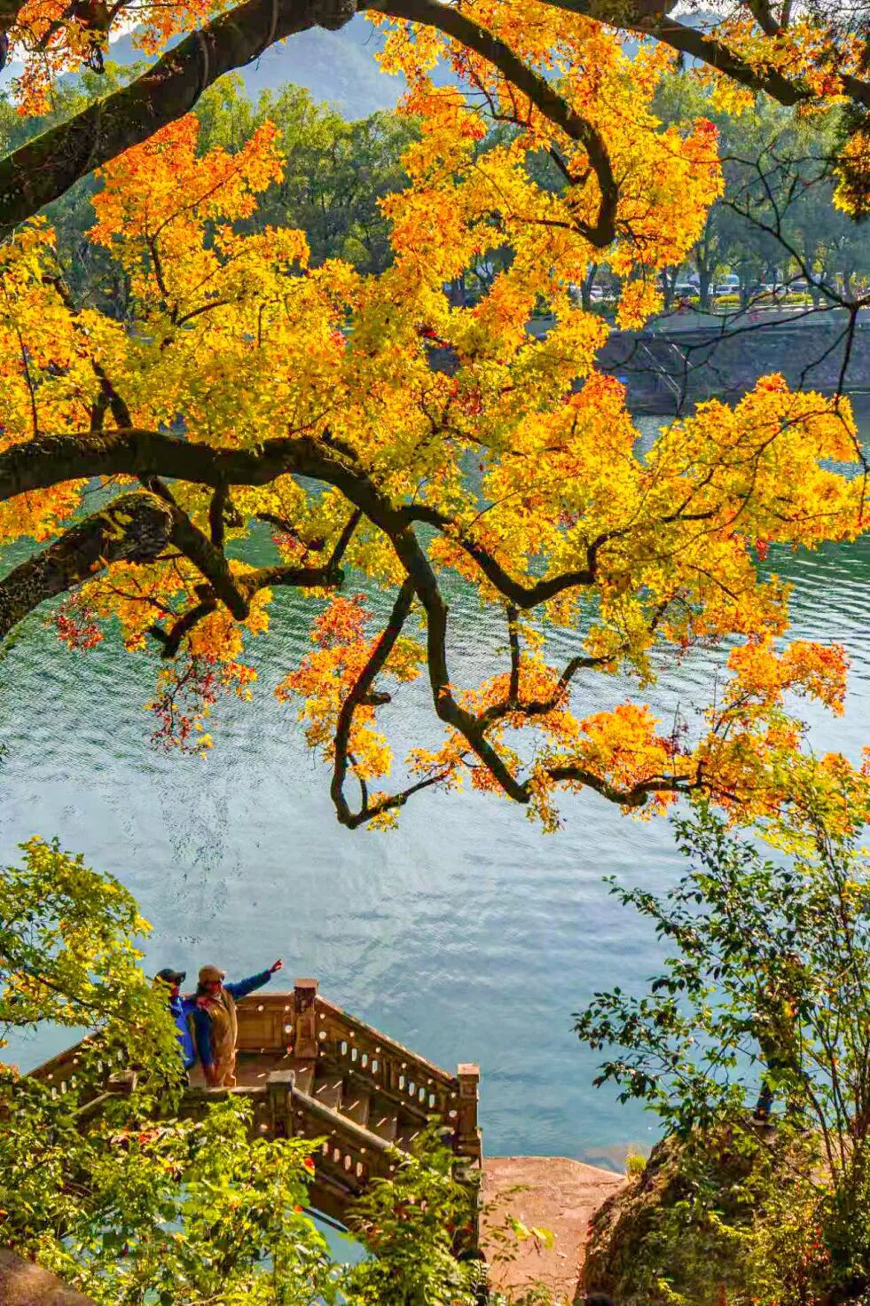树叶由翠绿渐变为金黄、锈红,倒映碧水