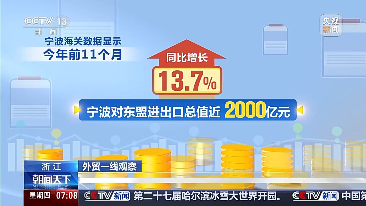 12月18日,央视新闻客户端发布文章《外贸一线观察丨开拓新兴市场 共建“一带一路”国家订单增长明显》,其中报道了宁波企业以技术实力与精准服务“圈粉”东盟市场。据宁波海关数据显示,今年前11个月,宁波对东盟进出口总值近2000亿元,同比增长13.7%。其中,机电产品作为宁波对东盟出口商品中的主力军,前11个月出口了近600亿元,增长22.9%。