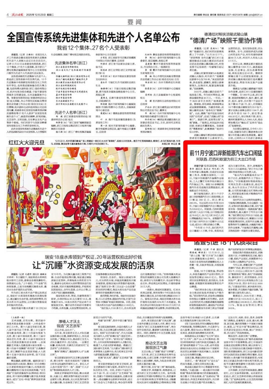 “今年前11个月,我们的汽车出口量超1.1万辆,中东、南美地区成为主要目的地。其中,新能源汽车出口占比超两成。”浙江中大元通国际贸易有限公司负责人介绍说。