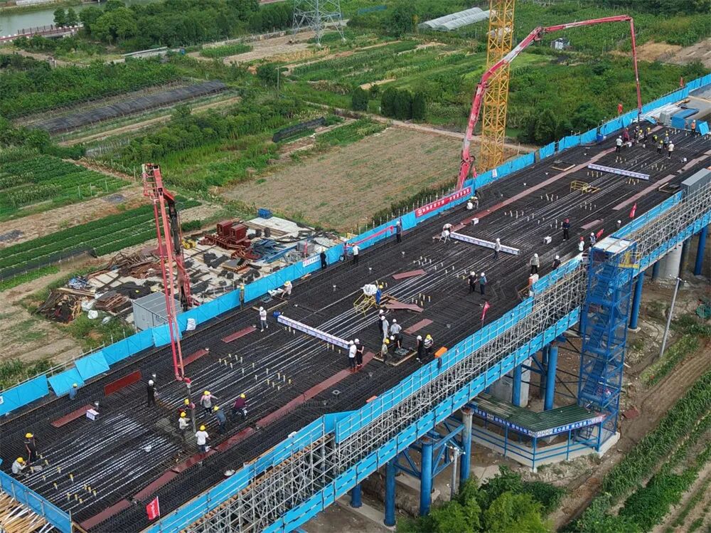 “这道连续梁的完工,意味着架梁通道上的最大‘堵点’被打通了。”施工现场负责人胡刚表示,全部8联连续梁均采用梁柱式支架现浇法施工,支架搭设高度在11至13米之间,单孔最大重量约130吨。