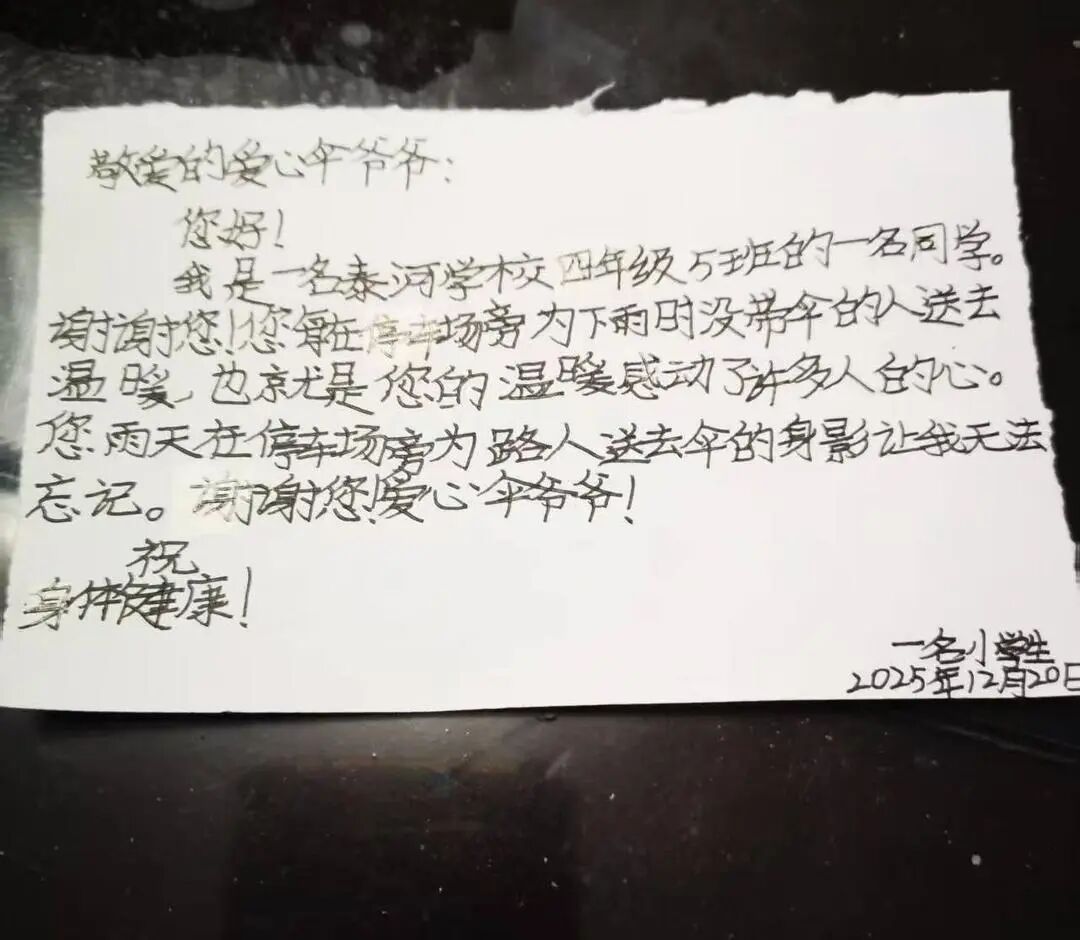 泰河学校405班的赵悦汛同学被爱心伞爷爷的故事深深感染,于是她将自己的感谢写进了信里。