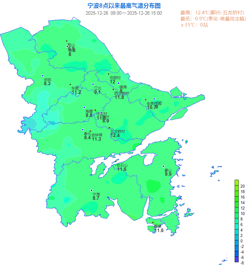 2025年12月26日8时至15时,宁波全市代表站气温最高为象山站9.9℃。