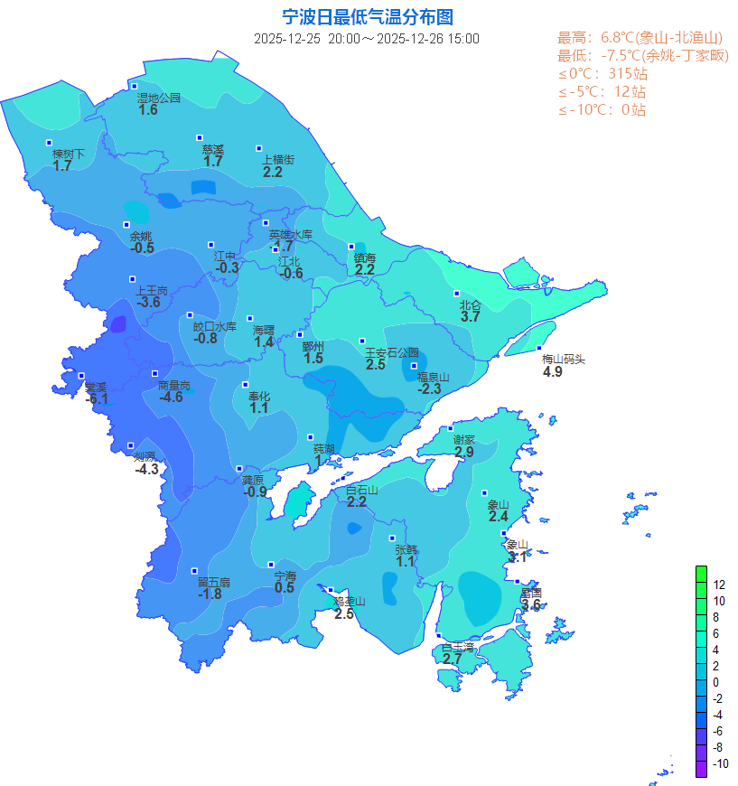 2025年12月25日20时至26日15时,宁波全市代表站气温最低为江北站-0.6℃。