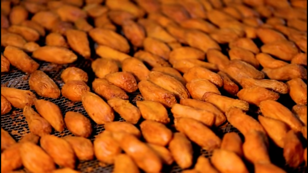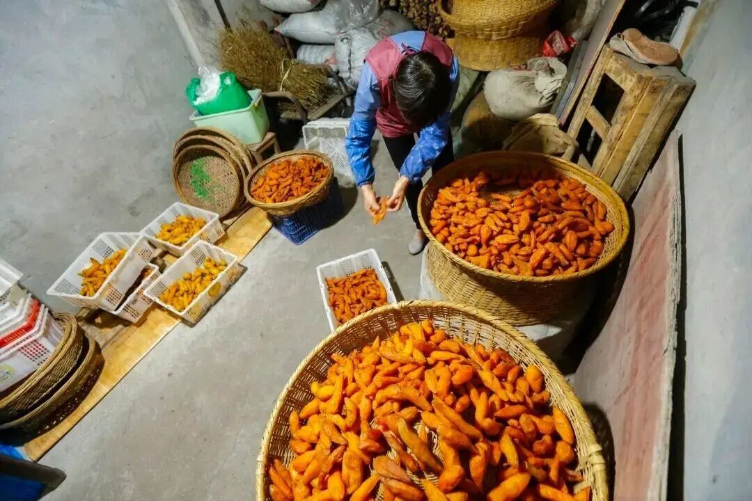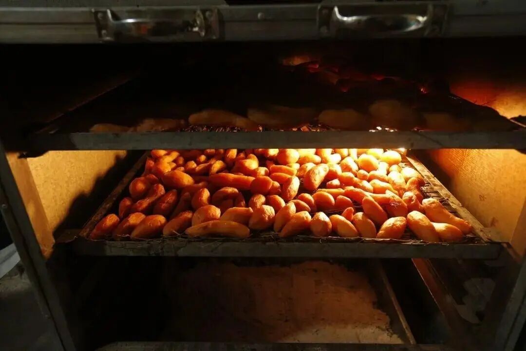 3、出锅冷却后,把番薯放到竹篦上,竹篦下面准备一个大火缸,缸底放上炭火,文火慢烤,时不时给番薯翻个身。待番薯烤到枣红色,呈半透明状,手捏硬实,略有弹性,就做好了。