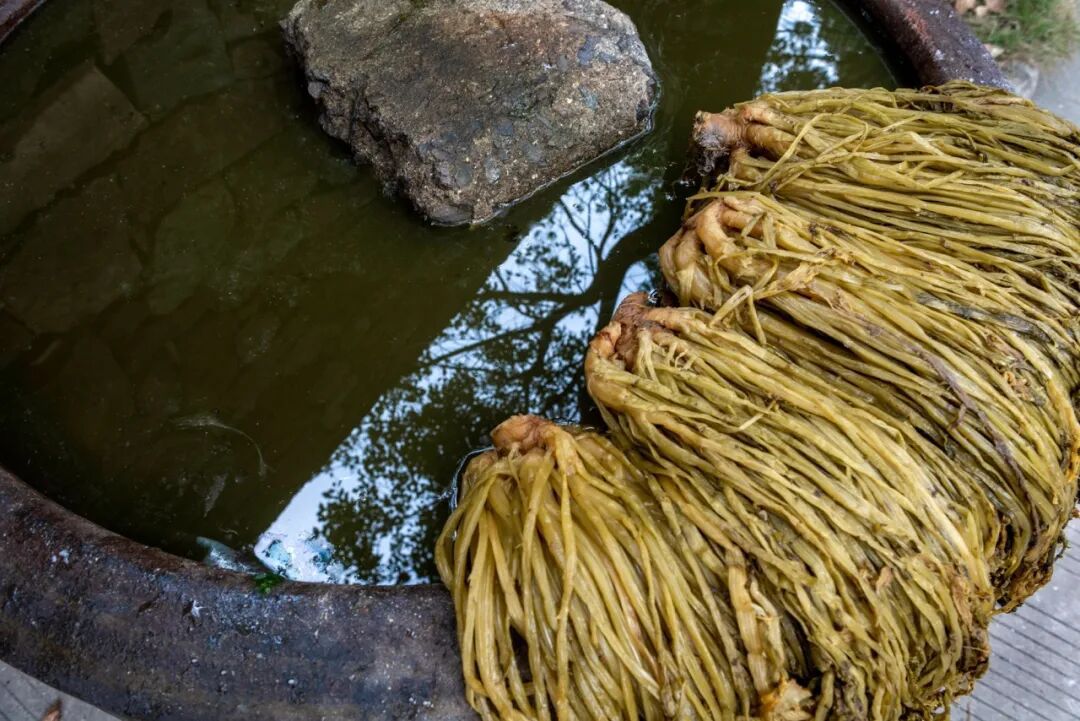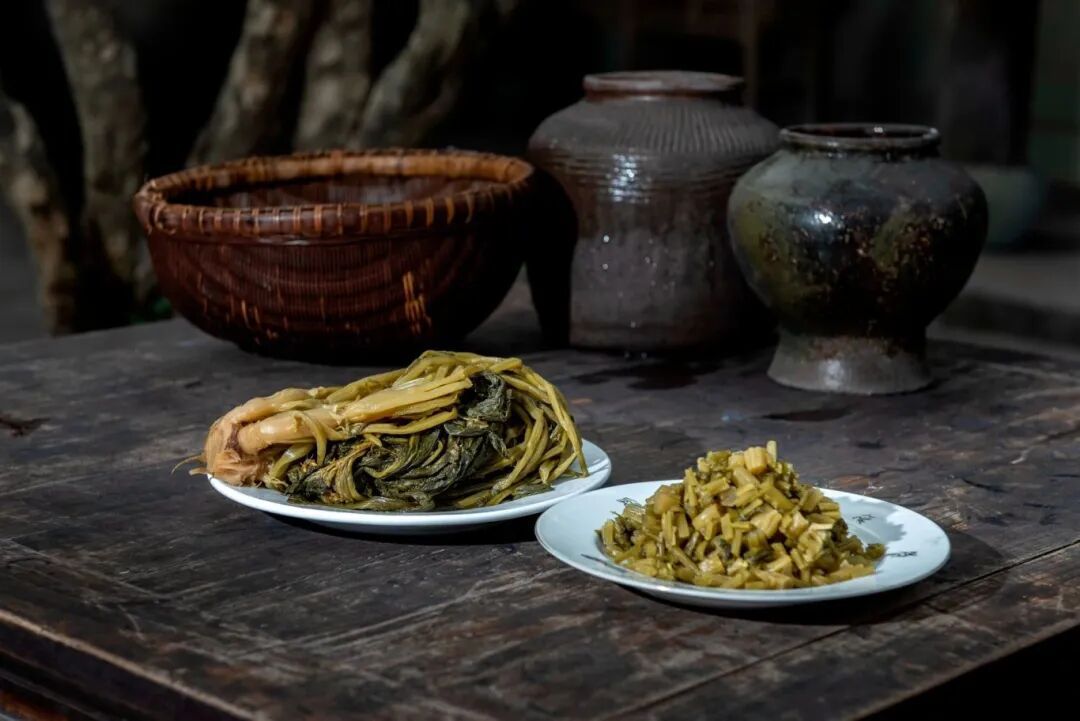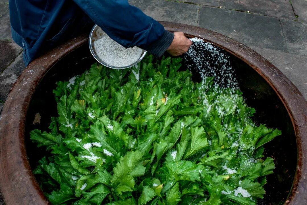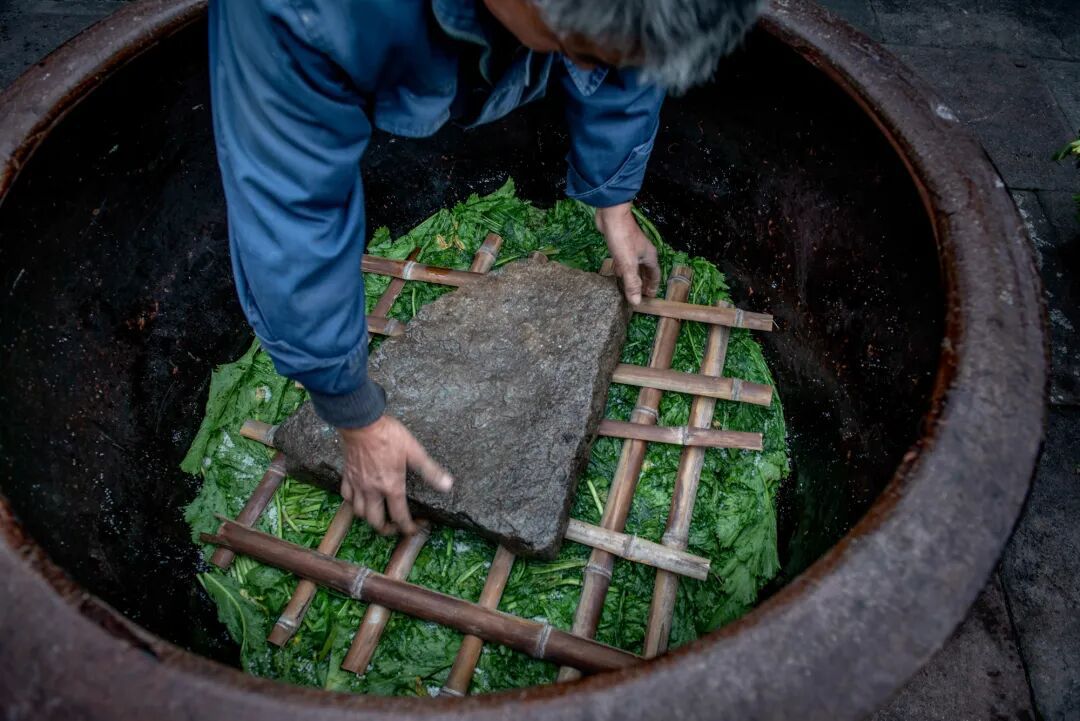 3、压上专属的“咸齑石头”,密封坛口,让雪里蕻静静发酵,蜕变为酸咸回甘、鲜爽开胃的地道风味。