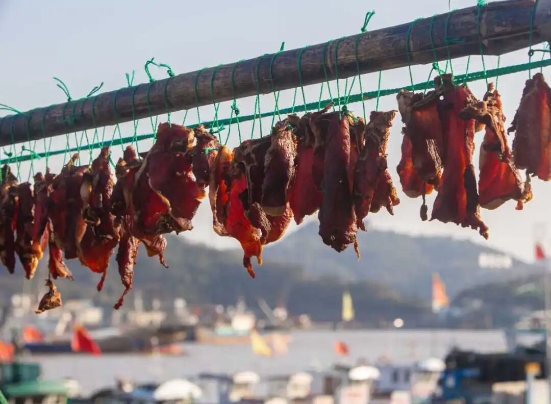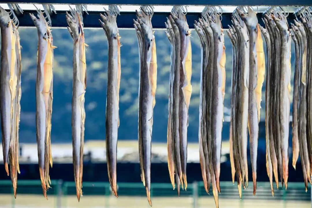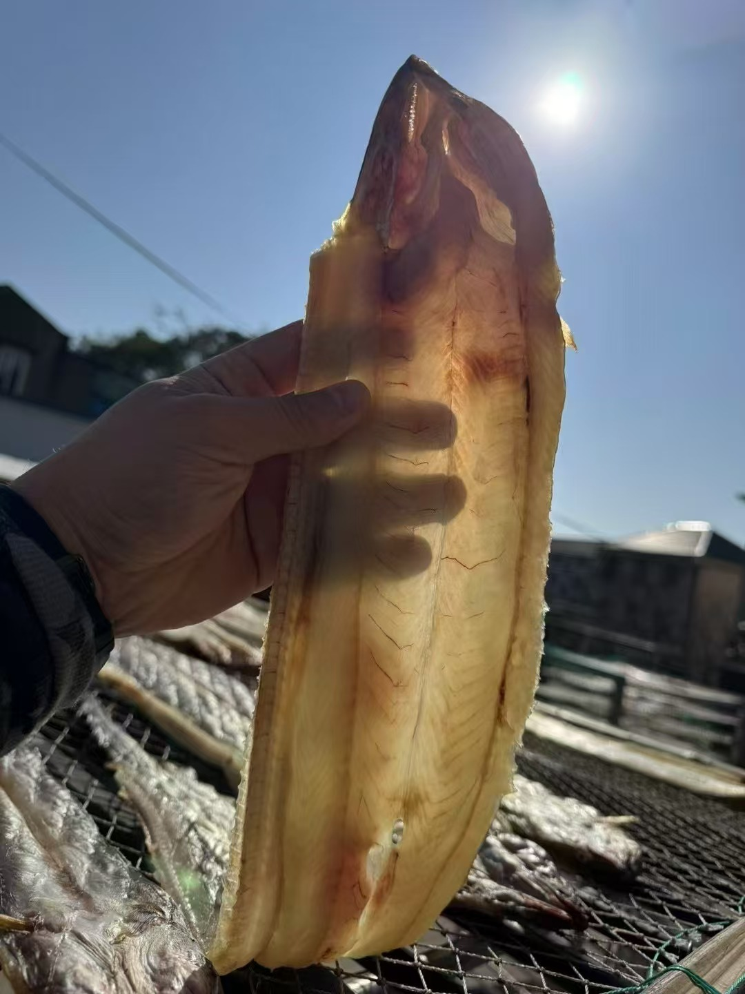 3、腌好后用清水冲洗掉表面盐分,再次擦干水分,用棉线穿过鱼鳃处,悬挂在通风向阳处。晾晒2-3天,至鱼肉收缩、表面干燥且略带油脂光泽。