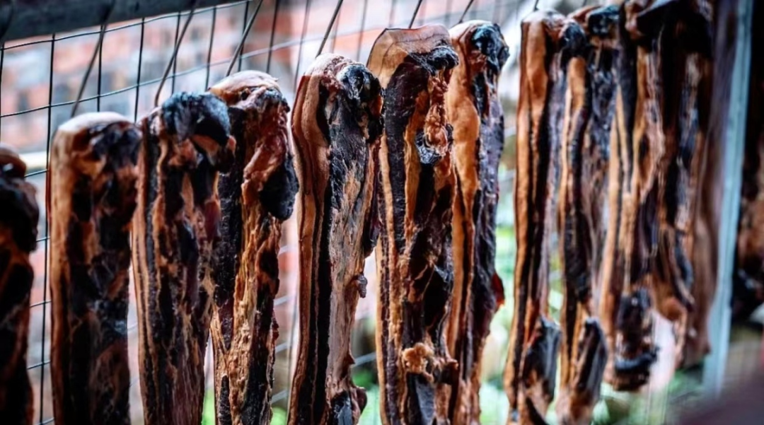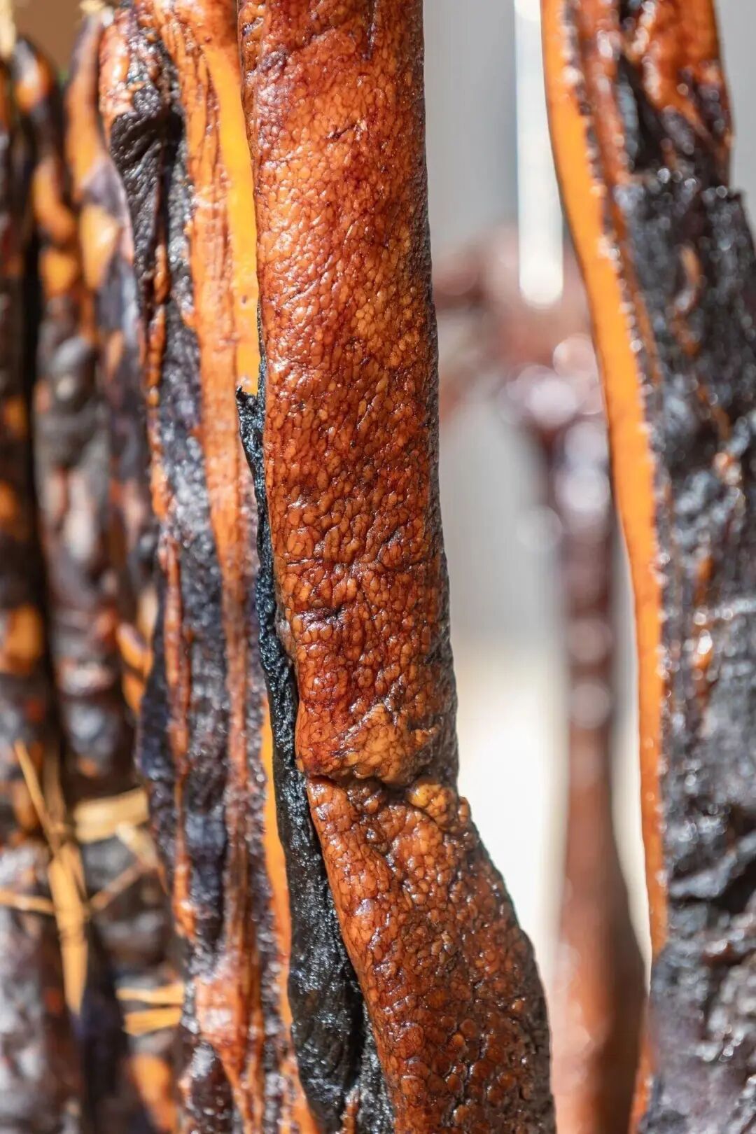 2、腌制好的肉条挂在通风阴凉处,自然风干。酱肉不宜风晒得太干,瘦肉部位有点硬硬的,无潮腻感就刚刚好。