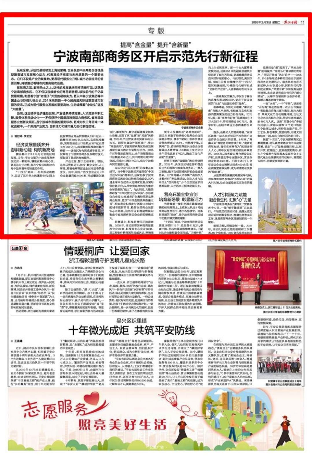 党群活动“潮”起来了。“旱地龙舟赛”的呐喊声、“南商BA”篮球赛的欢呼声、“书记开放麦”的讨论声……2025年,110余场形式多样的活动让宁波南部商务区充满活力。服务阵地也在不断延伸,针对快递小哥、网约车司机等新就业群体,“甬爱E家”水街服务站即将投用,未来这里将成为他们的“暖心驿站”。从楼宇白领到新业态劳动者,温暖正覆盖到每个群体。
