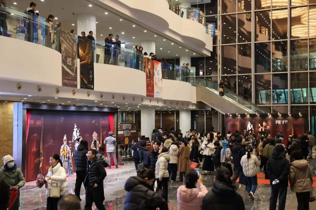 舞剧《天工开物》演出前,观众在宁波大剧院前厅自拍。