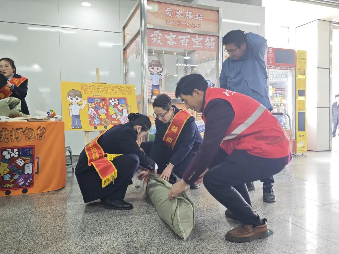 鼓楼站“礼好·春运”帮扶小队提供免费行李寄存服务,并备有打包绳、打包袋、热水、充电宝等实用物资。