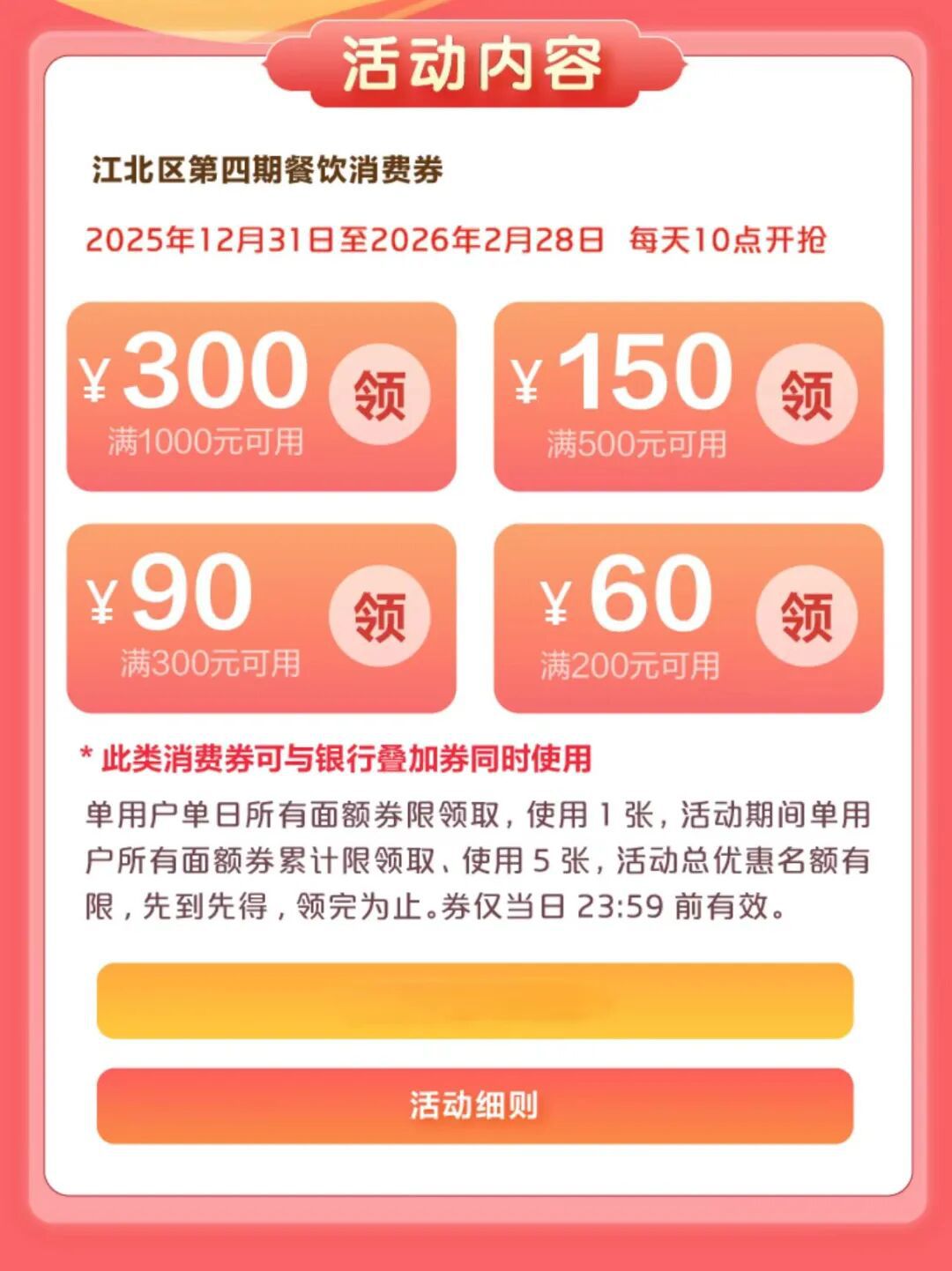 2026北仑区新春消费券来了,包括餐饮消费劵、通用消费券等。