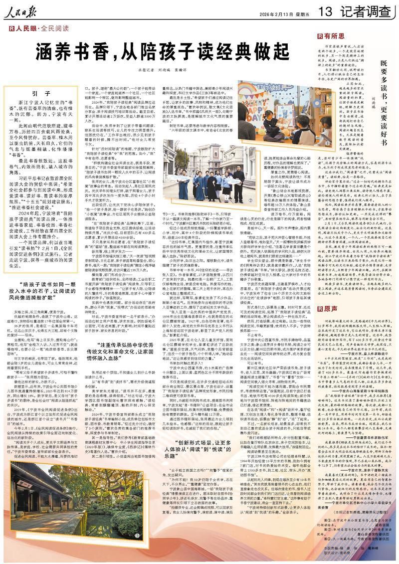 2月13日,《人民日报》整版刊发文章《涵养书香,从陪孩子读经典做起》,探寻宁波这座城市的阅读生活。