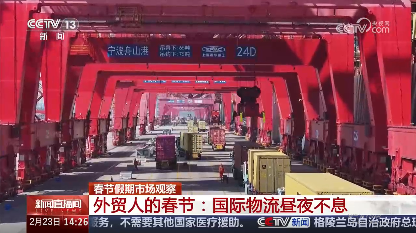 2月23日,央视《朝闻天下》《新闻直播间》《新闻观察》栏目播出《外贸人的春节:国际物流昼夜不息》,其中(视频56秒处)报道了宁波舟山港在春节期间,装卸作业24小时不间断。大年初一至初六,宁波舟山港完成集装箱吞吐量超78万标准箱,同比增长超17%。