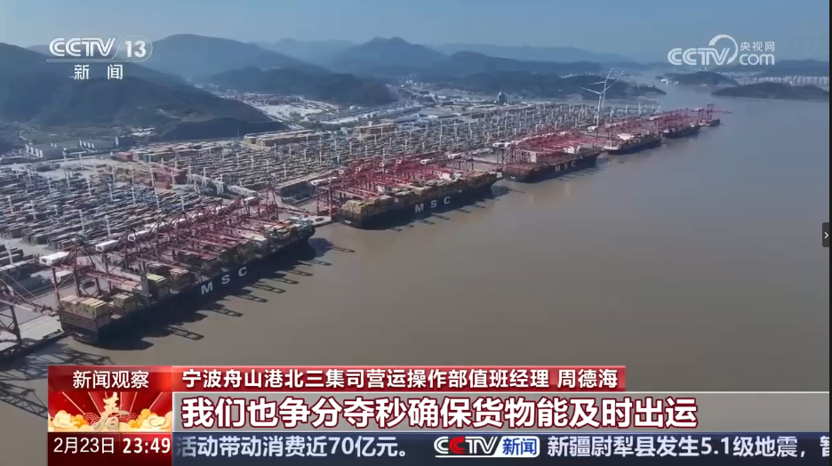 宁波舟山港北三集司营运操作部值班经理 周德海:这条船载重量超过了19万吨,这回在我们港区的作业量超过了两万标准箱,像这样的船型,整个春节期间还是比较多的。这几天出口箱量增长比较明显,我们现场是“人停机不停”。节后的第一波出口集中,客户都希望抢时间、赶船期,我们也争分夺秒确保货物能及时出运。