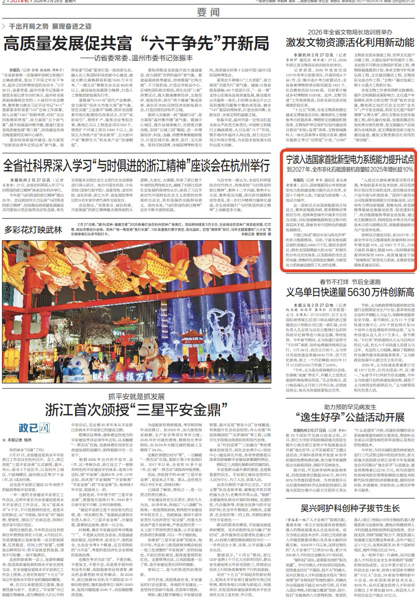 “入选试点意味着能更早抓住机遇,争取到更多在技术创新、项目投资和示范应用方面的支持,进而推动本地产业升级与机制改革。”国网宁波供电公司发展策划部副主任张振龙说,试点将有力带动新能源、智能电网、新型储能等基础设施建设投资,促进虚拟电厂、综合能源服务等新业态发展,通过在主配微协同、构网型技术等方向开展技术示范与规模应用,将能源基础转化为产业竞争优势。