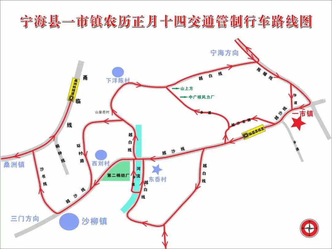 1. 越沙线(越沙线与陈蟠线交叉口——越沙线沙柳三角站路口):该路段实行单向行驶,禁止一切车辆由西往东行驶(禁止车辆由东岙往一市镇方向行驶),越沙线上禁止一切车辆停放;
