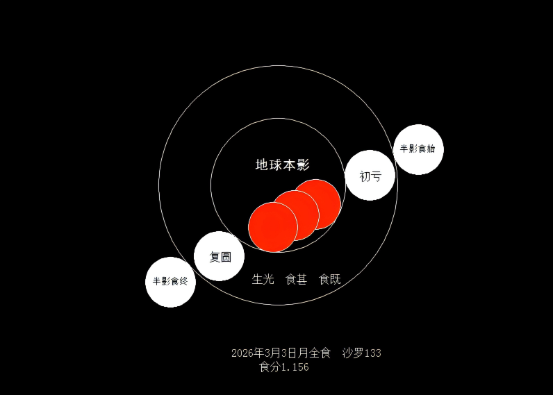 本次元宵月全食初亏约于北京时间3月3日17时50分开始,食既始于19时04分,食甚发生在19时34分,生光始于20时03分,最终于21时18分复圆。
