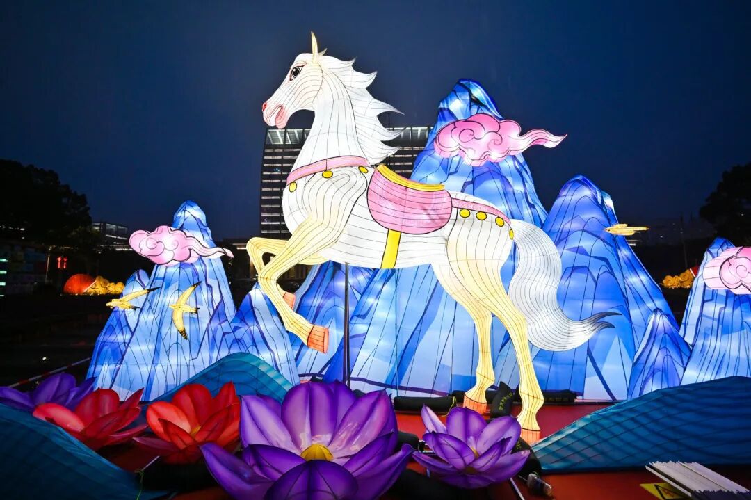 巨型 “马跃山海” 主灯霸气镇场,寓意着山海间的奔赴与奔腾,百家姓灯笼长廊铺成璀璨灯海,一步一景皆是国潮韵味。
