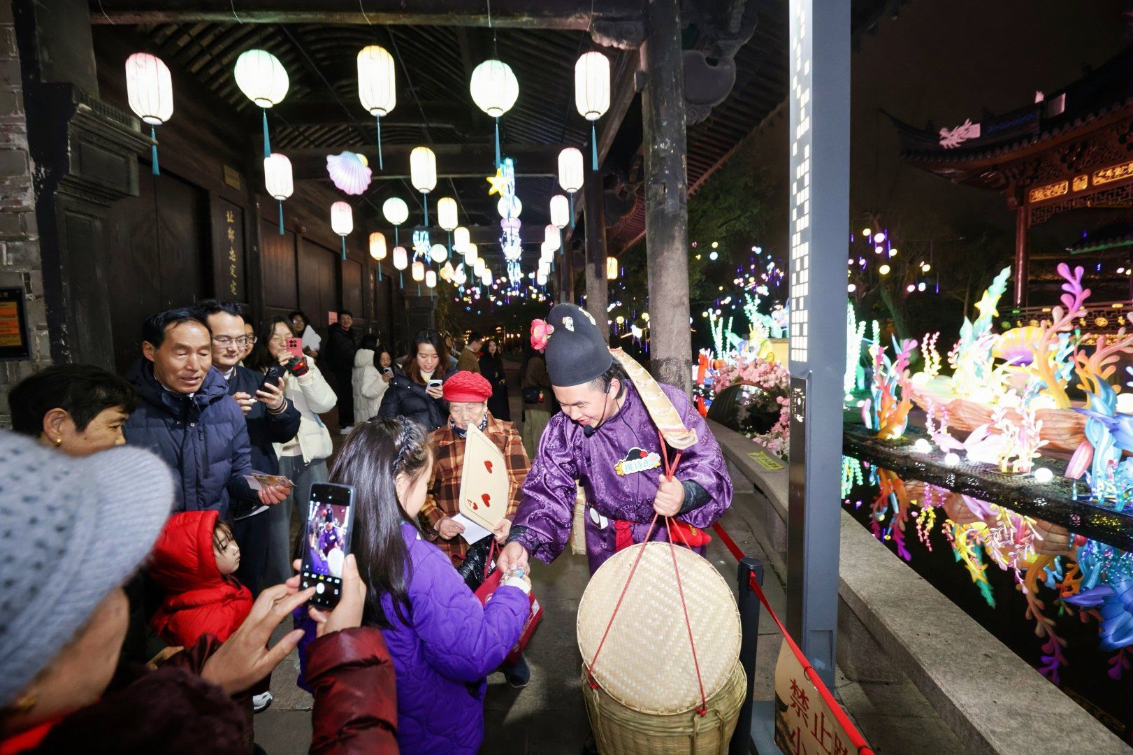 灯展现场,民俗表演、文艺节目轮番上演,鼓乐声声,人头攒动。大家一边行走,一边听讲解员讲述独属宁波的老故事。有人听得入神,有人已和新认识的朋友聊得热络。