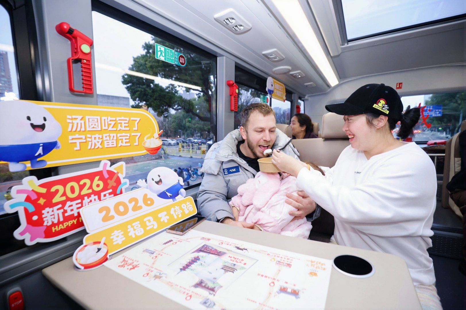 “小家伙,捧好碗,别‘吃着碗里的,看着锅里的’。”陈女士低头对儿子说的一句话,逗得大家哄堂大笑。吸引小孩眼球的,正是大巴内的萌趣IP“小汤圆”。