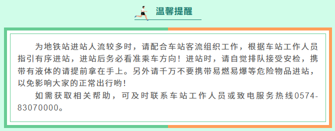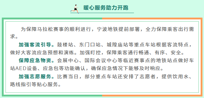 为让每一位跑者和市民畅行无忧,宁波地铁全线网提前开站,公交线路临时调整,全力保障赛事,陪你跑出城市活力!