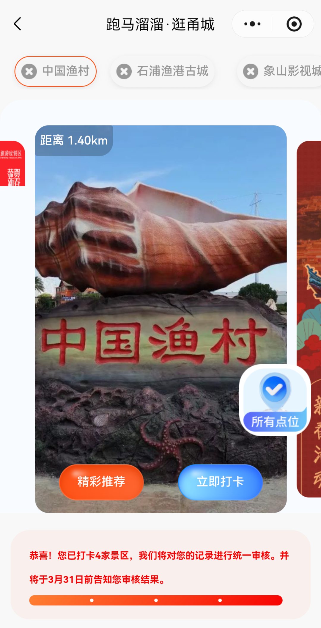 当您完成4个景区打卡后,工作人员将对您的记录进行统一审核,并将于3月31日前告知您审核结果。