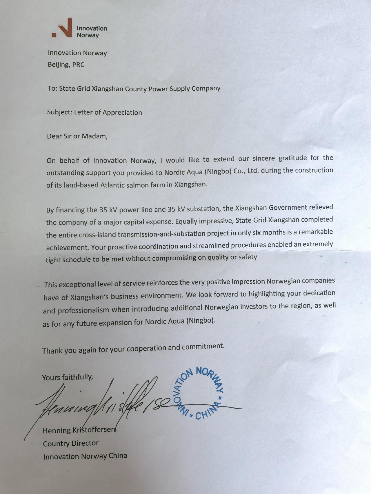 3月11日,挪威驻华大使馆参赞、挪威创新署中国区负责人汉宁·克里斯托弗森(Henning Kristoffersen)致信国网象山县供电公司,对象山县在诺帝克(宁波)水产有限公司陆基大西洋鲑鱼养殖项目建设过程中提供的高效、全方位服务保障表示诚挚感谢,并对当地优质的营商环境给予高度评价。