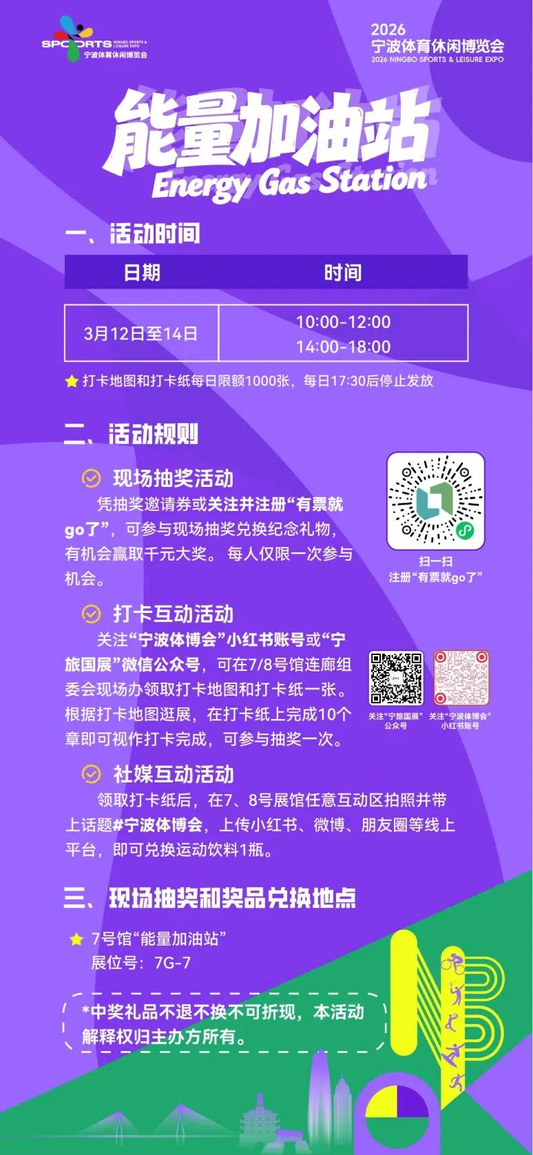 凭抽奖邀请券或关注注册“有票就go了”,可至7号馆“能量加油站”参与现场抽奖兑换纪念礼物,有机会赢取千元大奖。