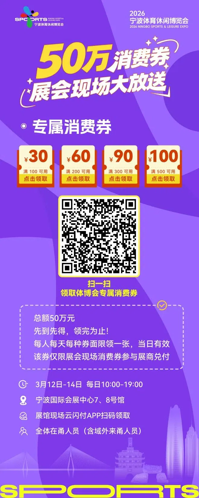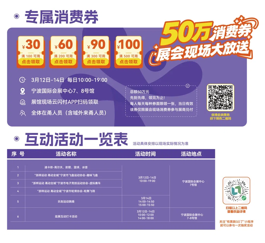 50万体博会专属消费券现场免费发放!逛展消费直接抵扣,无论是体育装备、户外用品,还是健身服务、运动科技,所有展位通通能用,省钱薅福利超划算!
