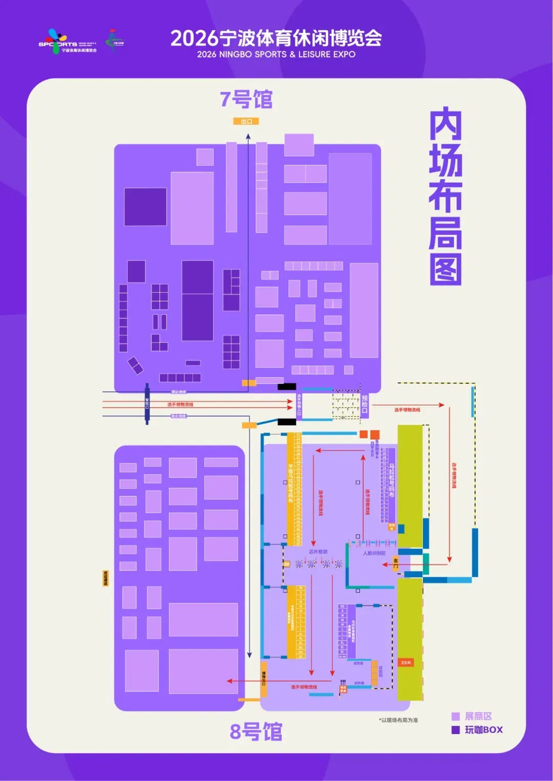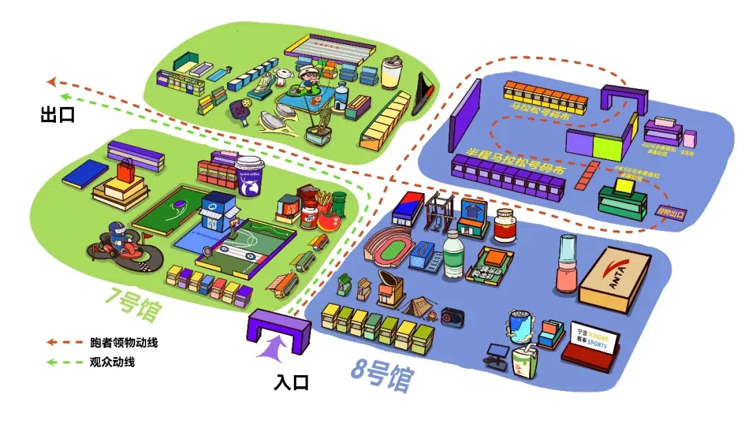 👉宁波马拉松选手:由7/8号连廊入场,穿过连廊直达8号馆领物区,领取赛事物资后即可直接进入展馆参观首届宁波体博会。