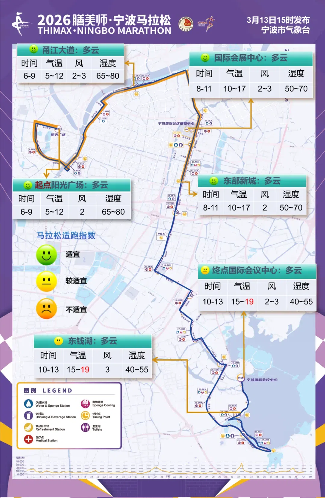 3月15日,2026·宁波马拉松即将开跑,快来查看最新适跑指数地图!比赛期间多云为主,气温总体适宜,午间气温略偏高,紫外线较强,运动员需注意做好防晒工作,并合理补充水分和电解质。预祝各位跑友安全完赛、斩获佳绩!