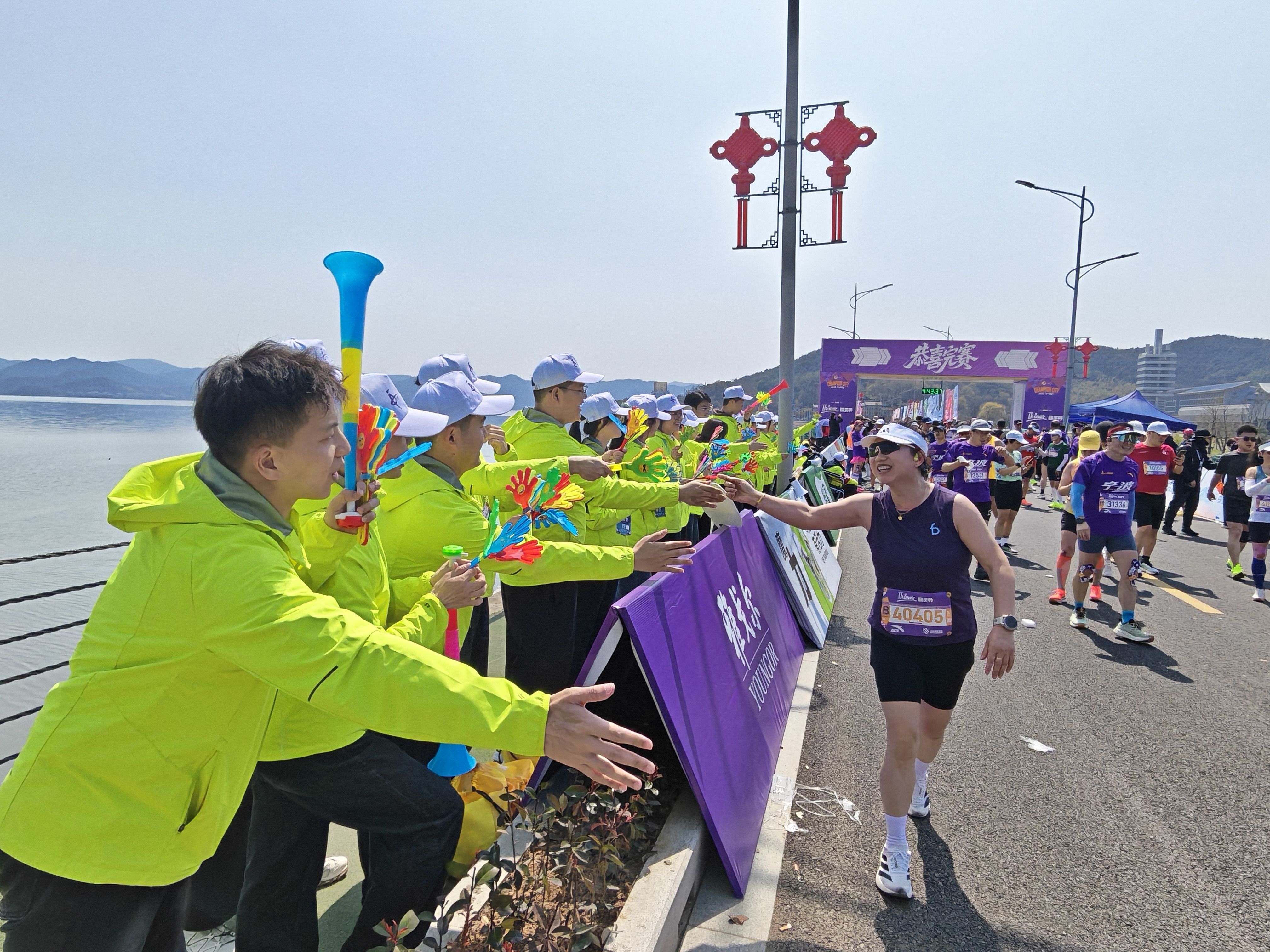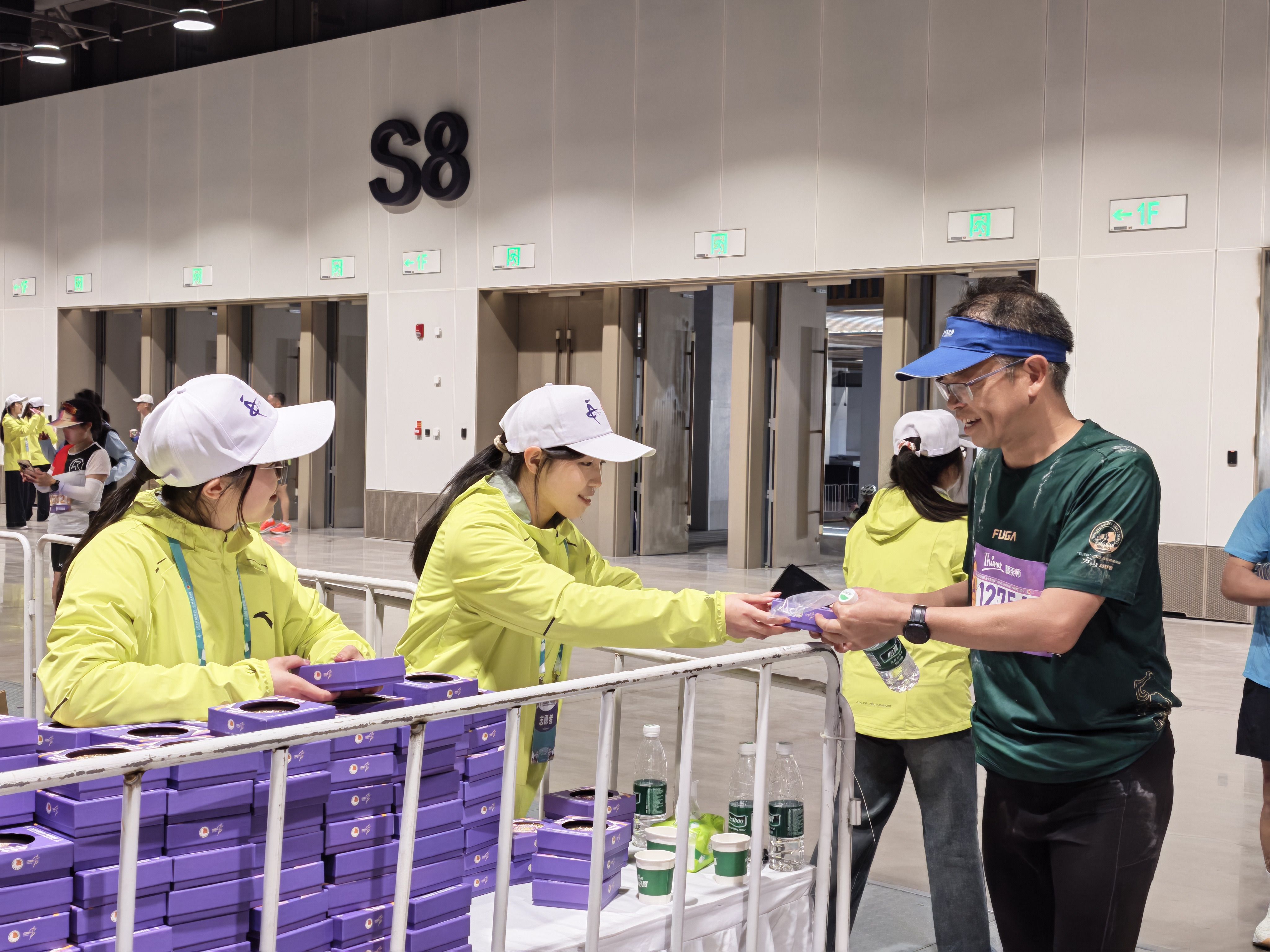 上午9:13,随着冠军选手加速冲过终点线,现场气氛瞬间被推向最高潮,赛道两旁的氛围组志愿者热情鼓掌并高声致意,为刚刚完成挑战的跑者营造热烈的完赛氛围。一声声“恭喜完赛”、“为您骄傲”的真诚问候,缓解了选手们极限运动后的身心疲惫,让终点现场充满了喜悦与肯定。从首位选手冲线时的万众欢呼,到最后一名跑者步履蹒跚却坚定抵达时的全场起立致敬,志愿者们将同样的热情贯穿了整整九个小时。无论快慢,每一位跨越终点的跑者,都是值得被铭记的勇士;每一次冲线,都值得最热烈的喝彩。