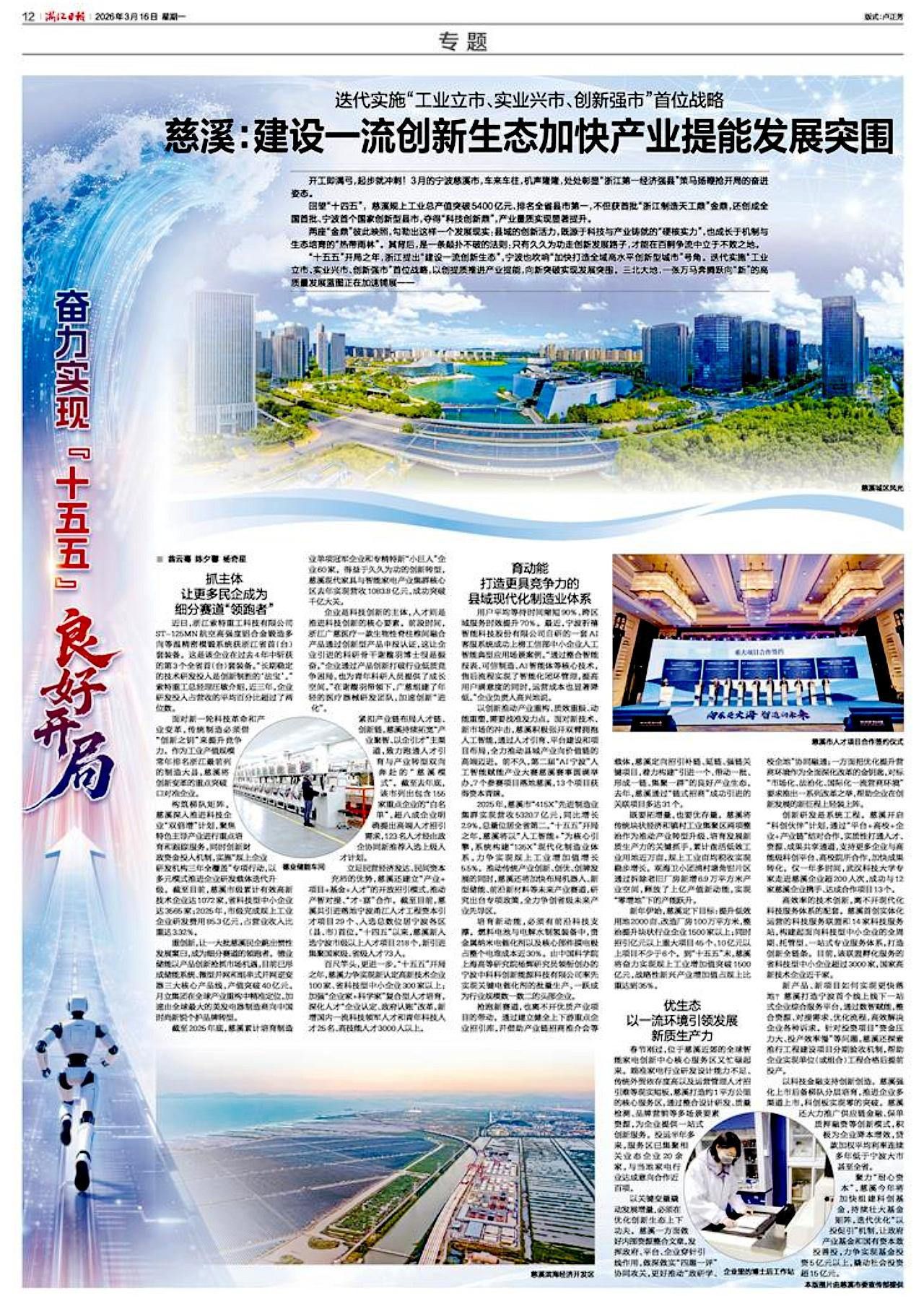 百尺竿头,更进一步。“十五五”开局之年,慈溪力争实现新认定高新技术企业100家、省科技型中小企业300家以上;加强“企业家+科学家”复合型人才培育,深化人才“企业认定、政府认账”改革,新增国内一流科技领军人才和青年科技人才25名、高技能人才3000人以上。